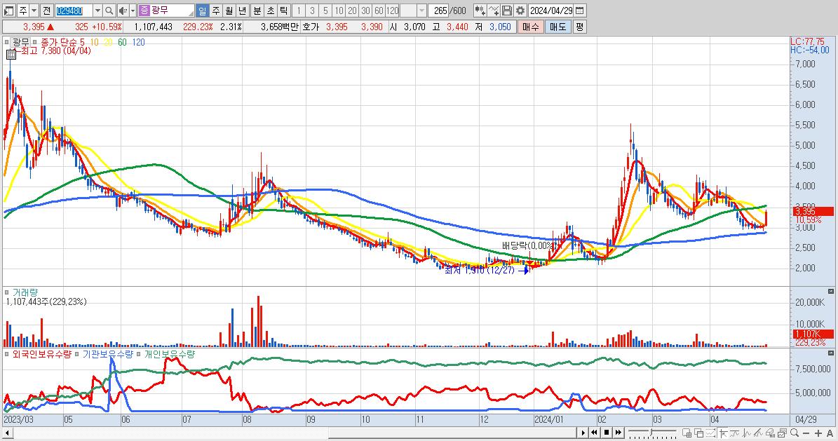 - 광무 (3,395원 ▲ 10.59% , 시총: 1,626억, 거래량: 1,107,443, 거래대금:37억)