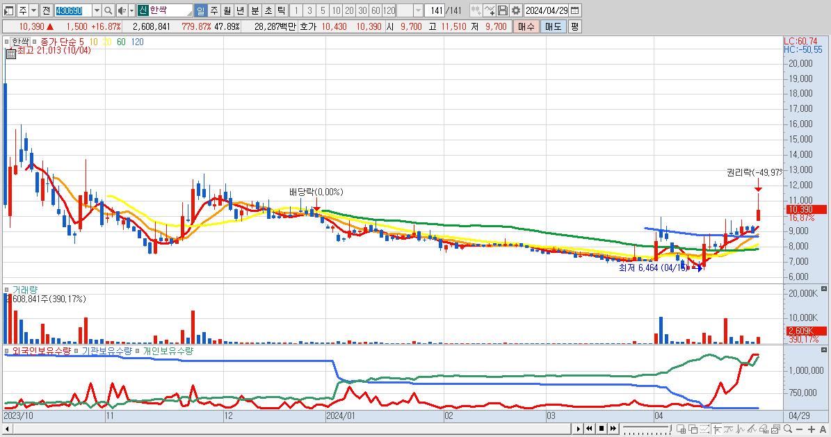- 한싹 (10,390원 ▲ 16.87% , 시총: 566억, 거래량: 2,608,841, 거래대금:283억)