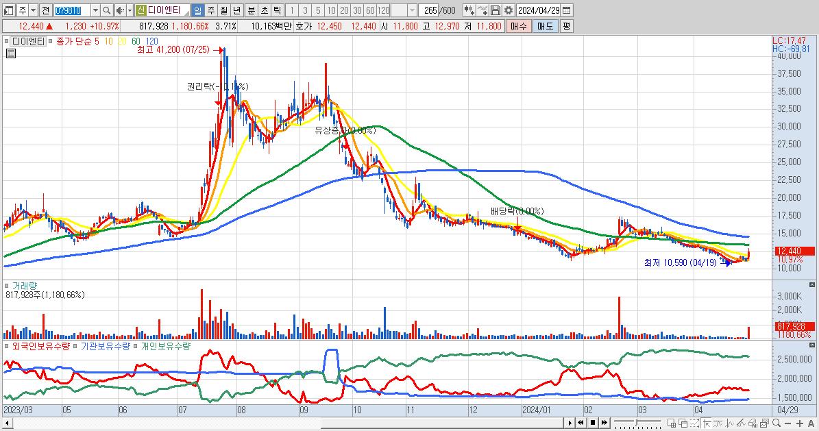 - 디이엔티 (12,440원 ▲ 10.97% , 시총: 2,740억, 거래량: 817,928, 거래대금:102억)