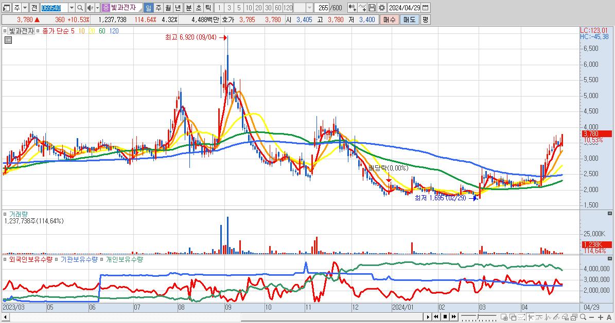 - 빛과전자 (3,780원 ▲ 10.53% , 시총: 1,082억, 거래량: 1,237,738, 거래대금:45억)