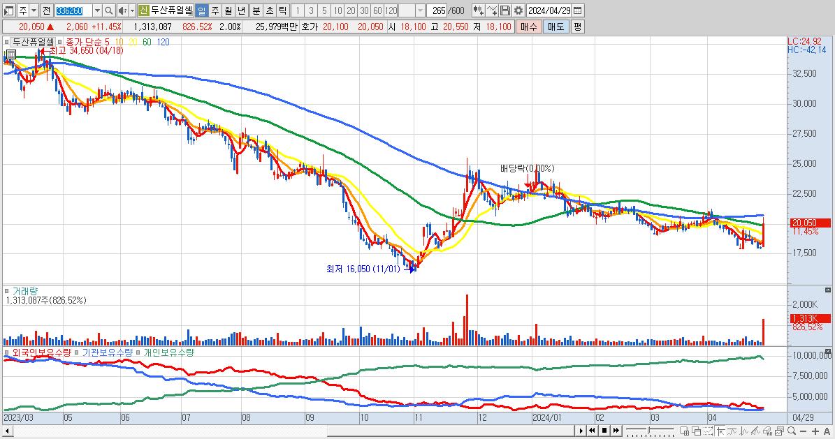 - 두산퓨얼셀 (20,050원 ▲ 11.45% , 시총: 13,131억, 거래량: 1,313,148, 거래대금:260억)