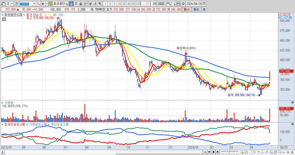 - 효성첨단소재 (372,000원 ▲ 10.39% , 시총: 16,665억, 거래량: 102,307, 거래대금:368억)