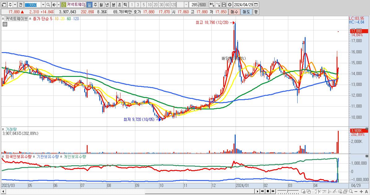 - 커넥트웨이브 (17,880원 ▲ 14.84% , 시총: 8,358억, 거래량: 3,907,843, 거래대금:698억)