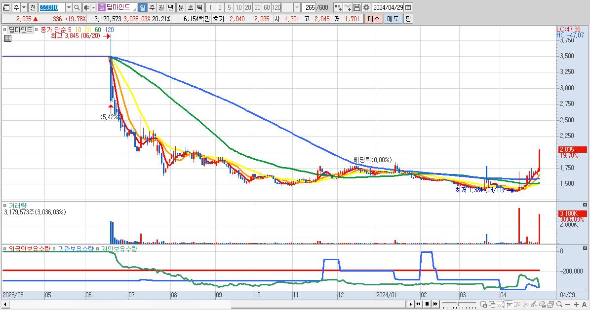 - 딥마인드 (2,035원 ▲ 19.78% , 시총: 320억, 거래량: 3,179,573, 거래대금:62억)
