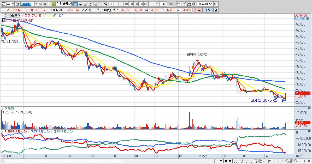 - 한화솔루션 (26,300원 ▲ 13.61% , 시총: 45,208억, 거래량: 3,826,505, 거래대금:971억)