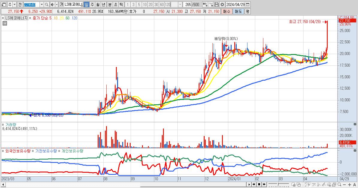 - LS에코에너지 (27,150원 ▲ 29.9% , 시총: 8,315억, 거래량: 6,414,824, 거래대금:1,640억)
