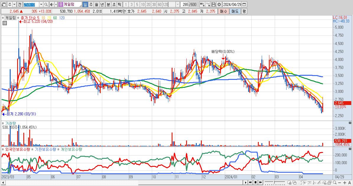 - 케일럼 (2,645원 ▲ 13.03% , 시총: 709억, 거래량: 538,793, 거래대금:14억)