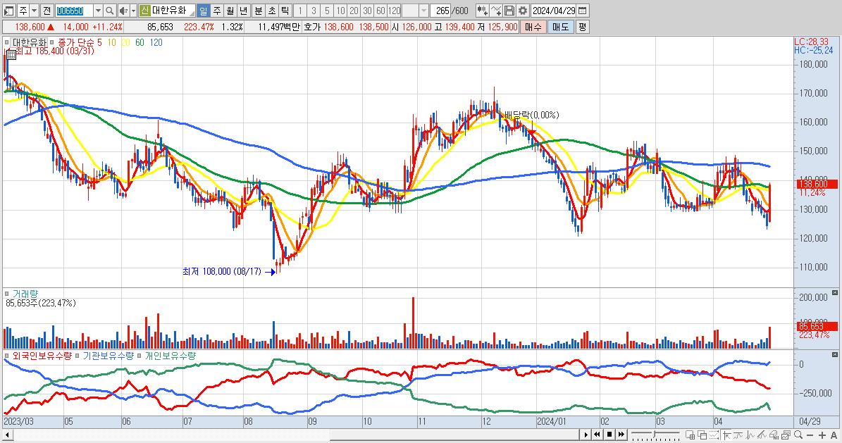 - 대한유화 (138,600원 ▲ 11.24% , 시총: 9,009억, 거래량: 85,658, 거래대금:115억)