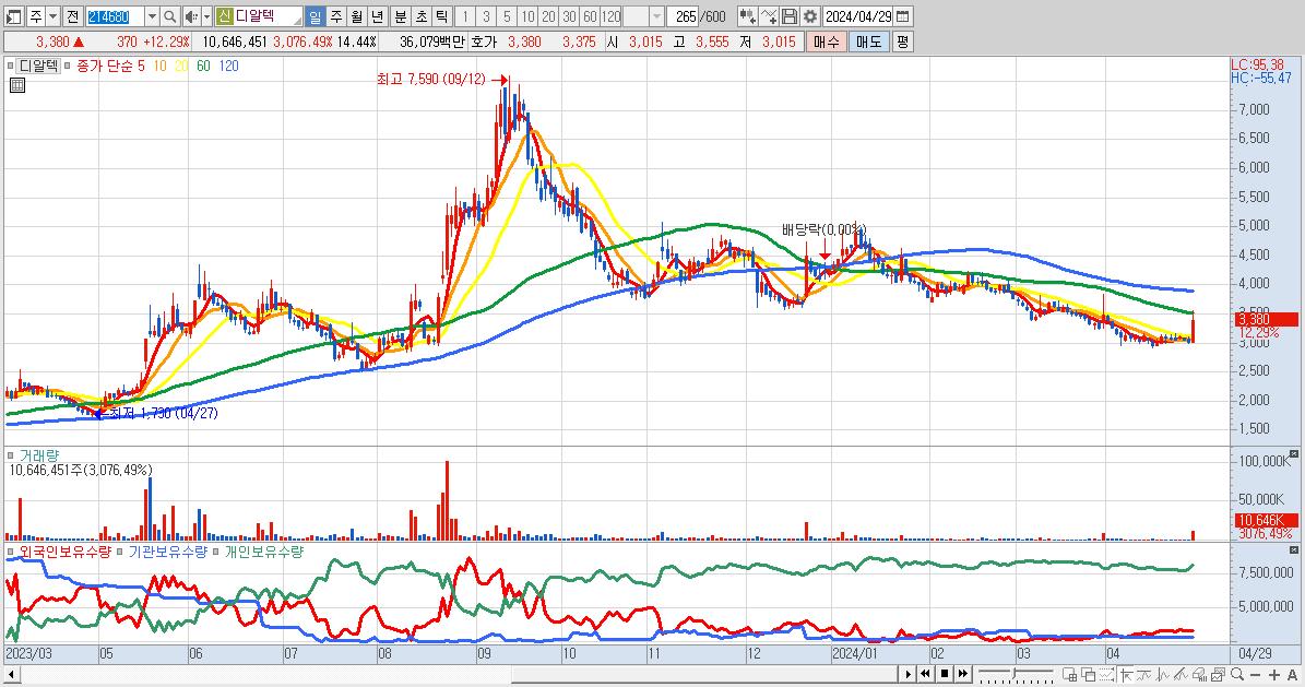 - 디알텍 (3,380원 ▲ 12.29% , 시총: 2,492억, 거래량: 10,646,451, 거래대금:361억)