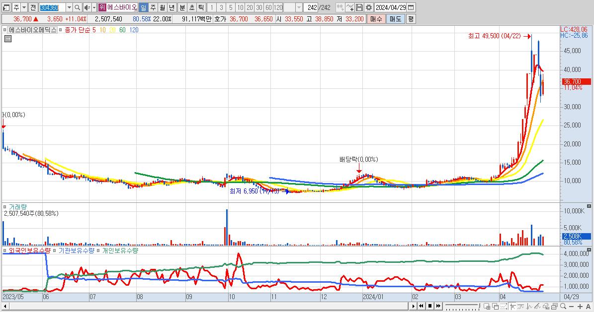 - 에스바이오메딕스 (36,700원 ▲ 11.04% , 시총: 4,183억, 거래량: 2,507,540, 거래대금:911억)