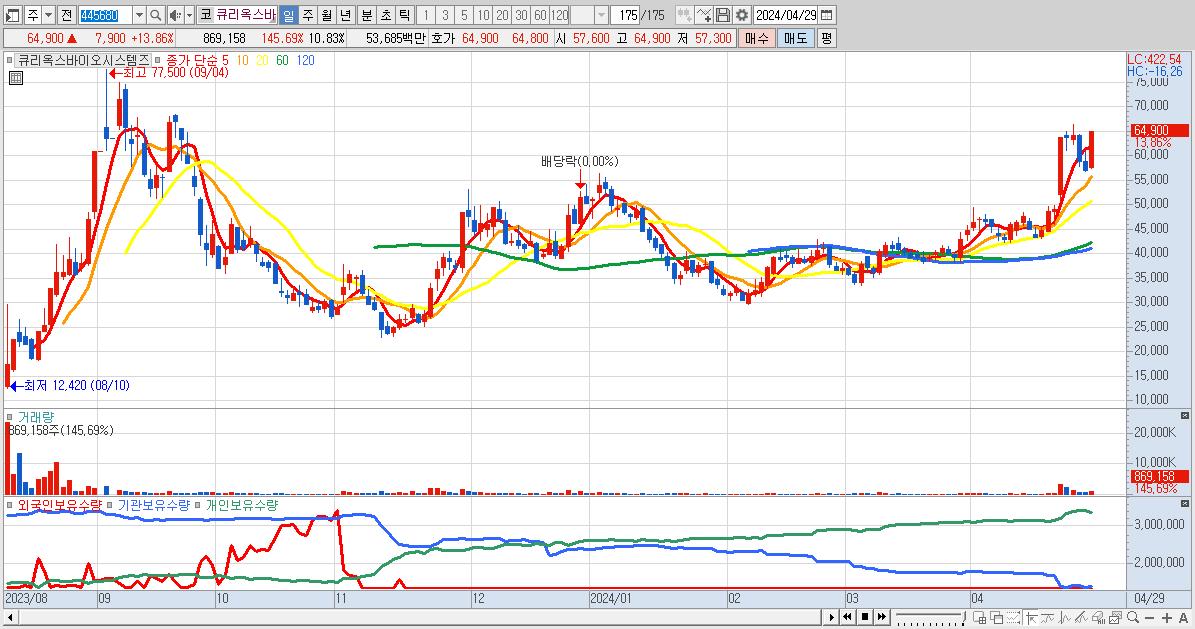- 큐리옥스바이오시스템즈 (64,900원 ▲ 13.86% , 시총: 5,207억, 거래량: 869,158, 거래대금:537억)