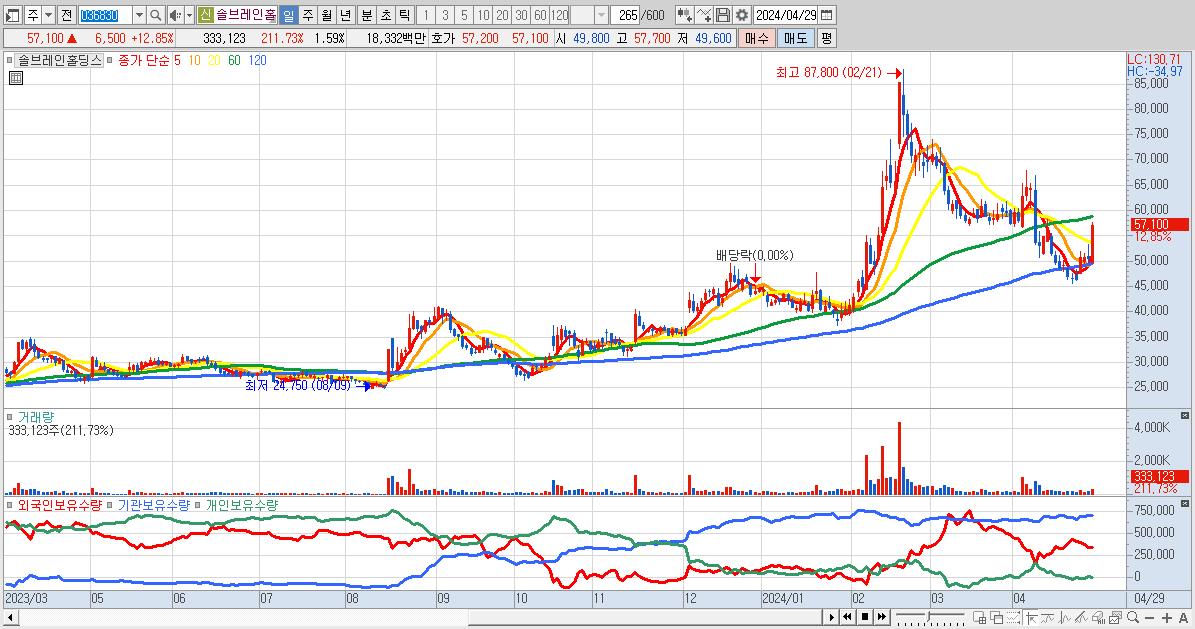 - 솔브레인홀딩스 (57,100원 ▲ 12.85% , 시총: 11,970억, 거래량: 333,123, 거래대금:183억)