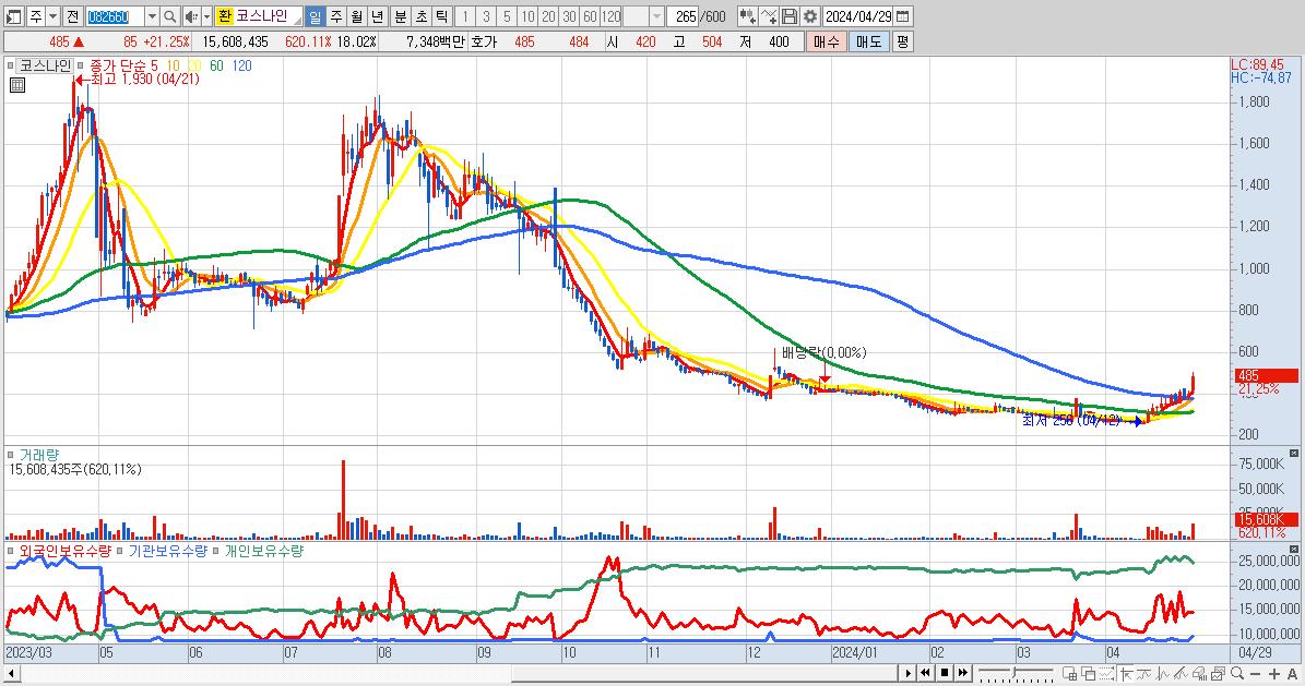 - 코스나인 (485원 ▲ 21.25% , 시총: 420억, 거래량: 15,608,435, 거래대금:73억)