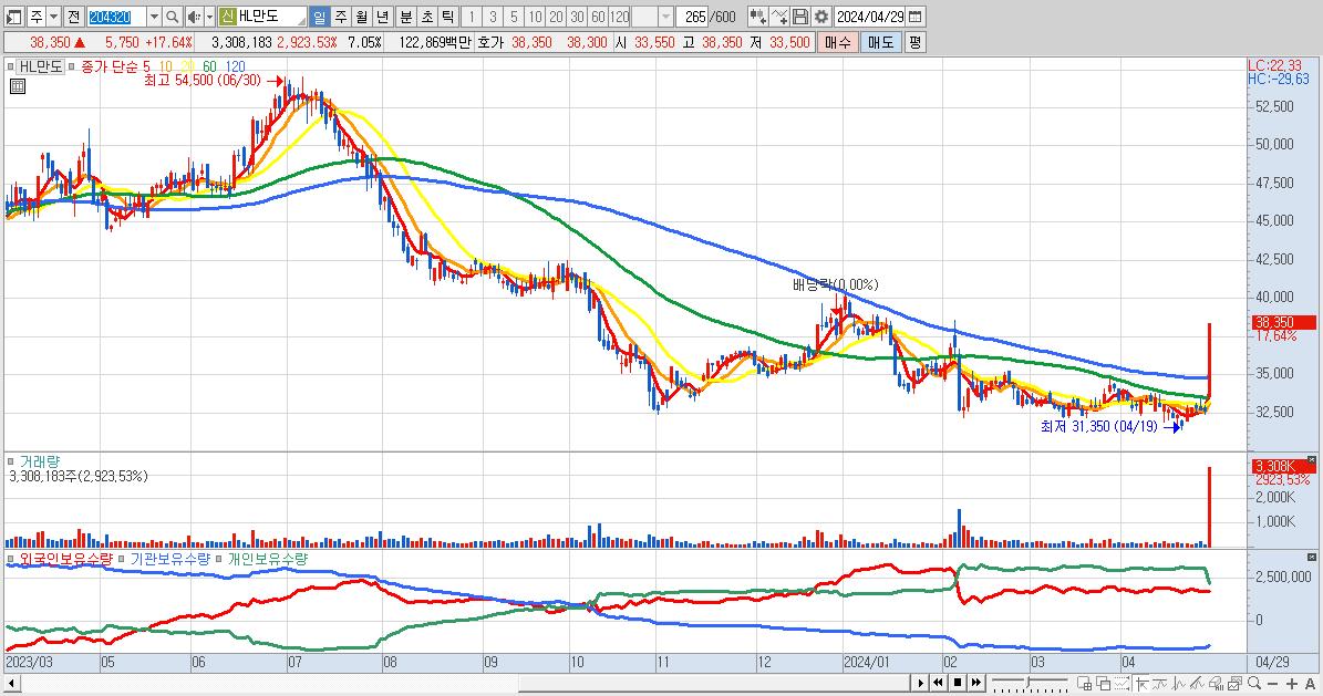 - HL만도 (38,350원 ▲ 17.64% , 시총: 18,008억, 거래량: 3,308,233, 거래대금:1,229억)