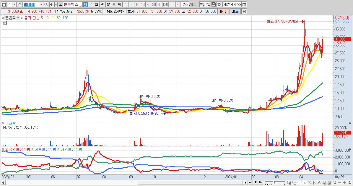 - 필옵틱스 (31,850원 ▲ 18.4% , 시총: 7,257억, 거래량: 14,757,542, 거래대금:4,467억)