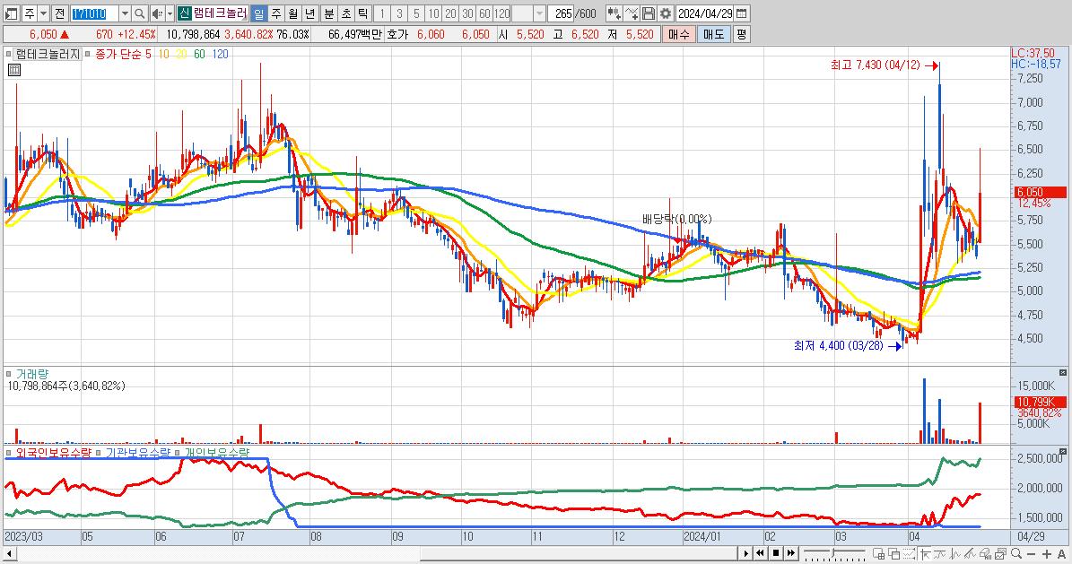 - 램테크놀러지 (6,050원 ▲ 12.45% , 시총: 859억, 거래량: 10,798,864, 거래대금:665억)