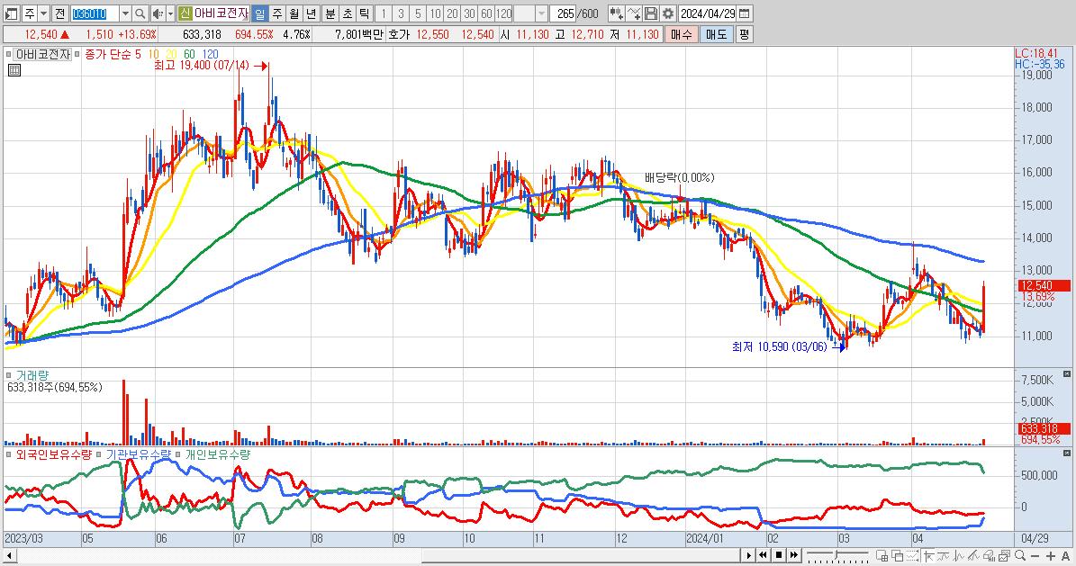 - 아비코전자 (12,540원 ▲ 13.69% , 시총: 1,667억, 거래량: 633,318, 거래대금:78억)