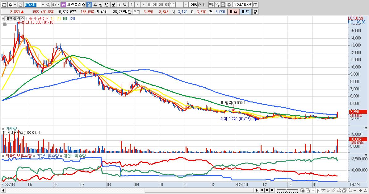 - 이엔플러스 (3,850원 ▲ 20.88% , 시총: 2,700억, 거래량: 10,804,677, 거래대금:388억)