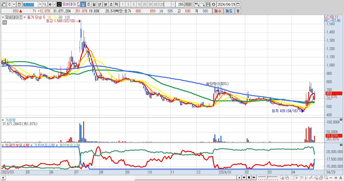 - 모비데이즈 (659원 ▲ 12.07% , 시총: 1,060억, 거래량: 31,671,284, 거래대금:205억)