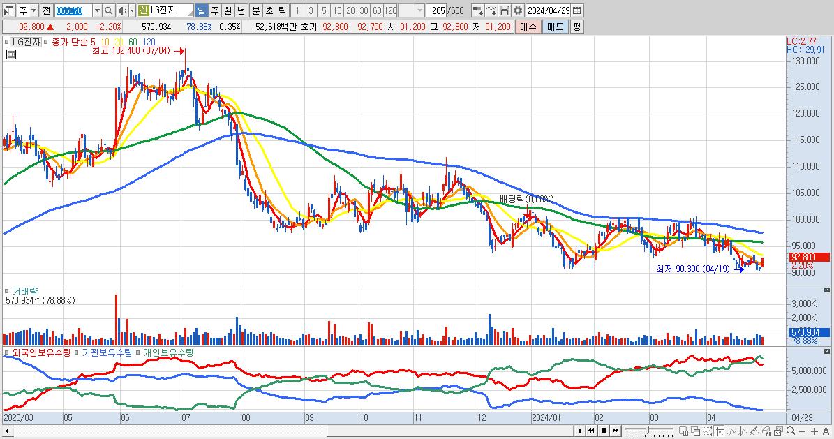 - LG전자 (92,800원 ▲ 2.2% , 시총: 151,865억, 외국인 순매수 거래금:212억)