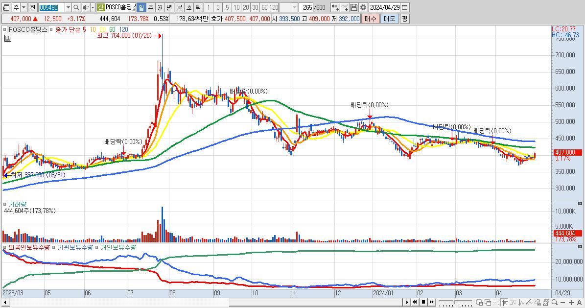 - POSCO홀딩스 (407,000원 ▲ 3.17% , 시총: 344,205억, 외국인 순매수 거래금:311억)