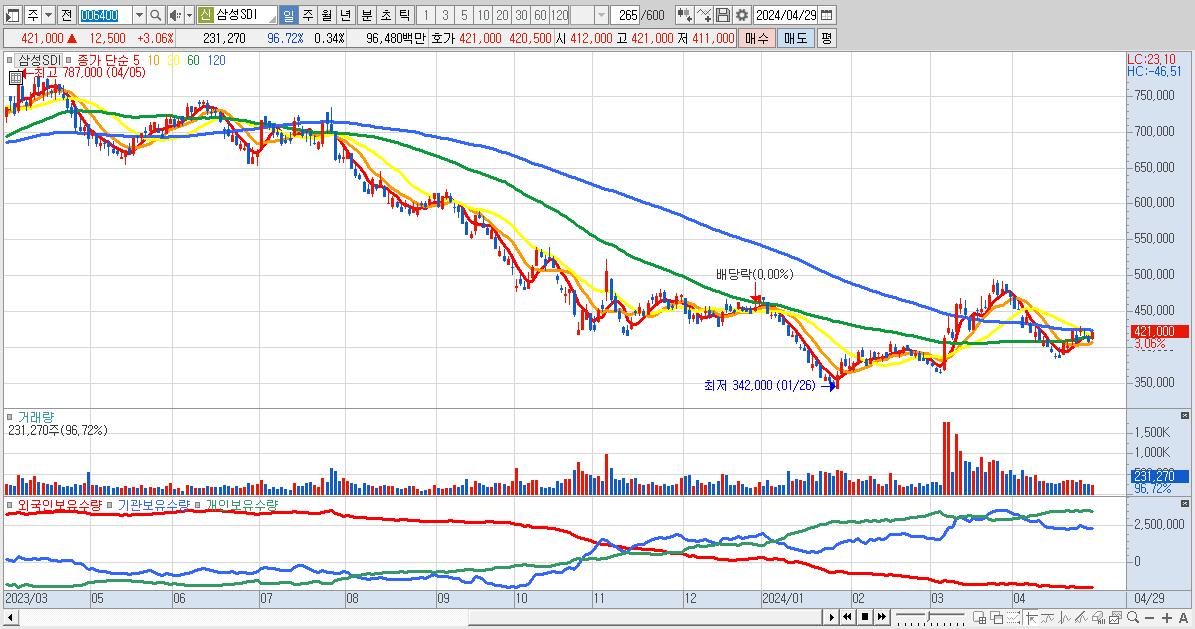 - 삼성SDI (421,000원 ▲ 3.06% , 시총: 289,499억, 외국인 순매수 거래금:248억)