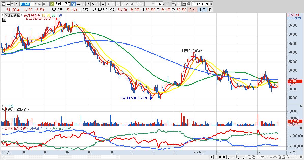 - 씨에스윈드 (54,100원 ▲ 8.2% , 시총: 22,815억, 외국인 순매수 거래금:111억)