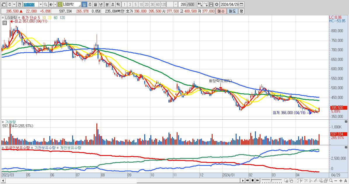 - LG화학 (395,500원 ▲ 5.89% , 시총: 279,193억, 외국인 순매수 거래금:405억)