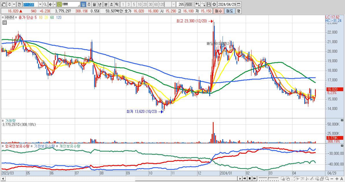 - HMM (16,020원 ▲ 6.23% , 시총: 110,384억, 외국인 순매수 거래금:122억)