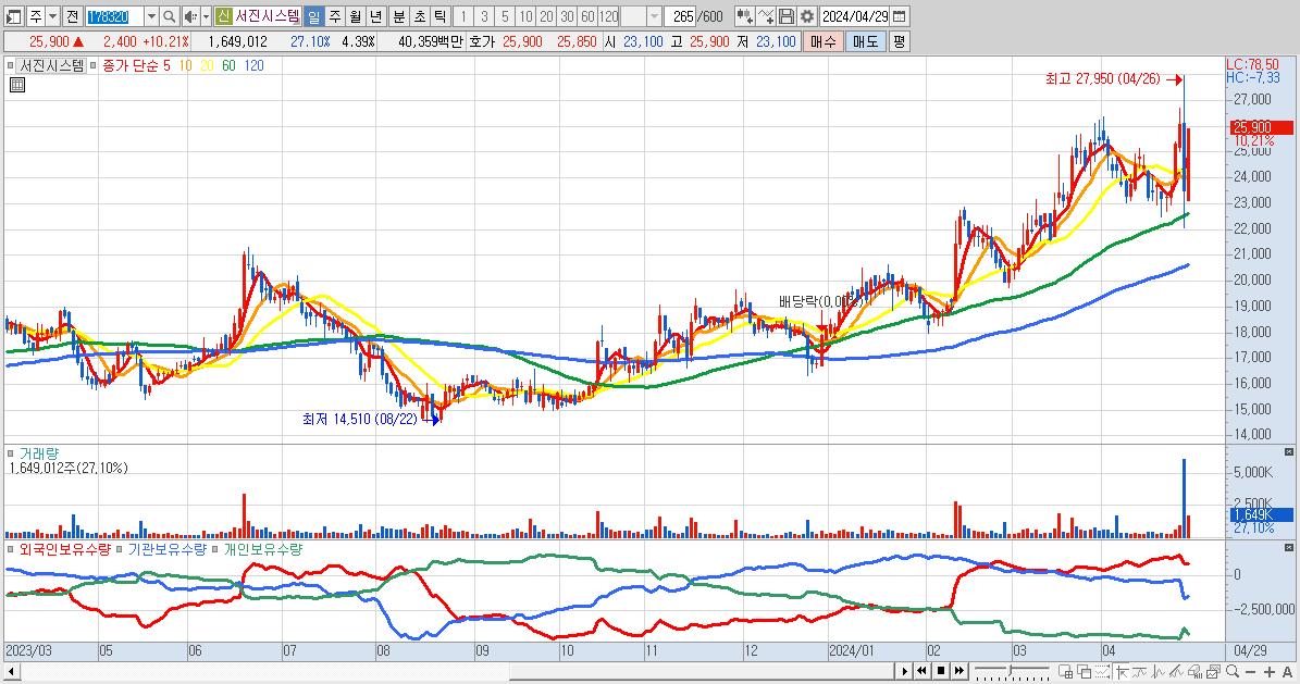 - 서진시스템 (25,900원 ▲ 10.21% , 시총: 9,733억, 외국인 순매수 거래금:88억)