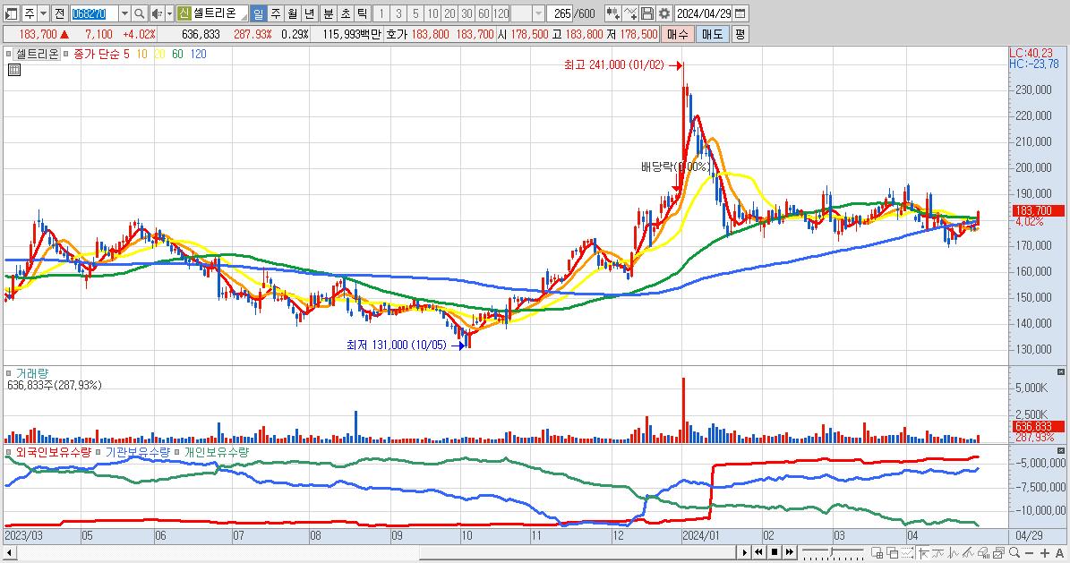 - 셀트리온 (183,700원 ▲ 4.02% , 시총: 400,557억, 외국인 순매수 거래금:380억)