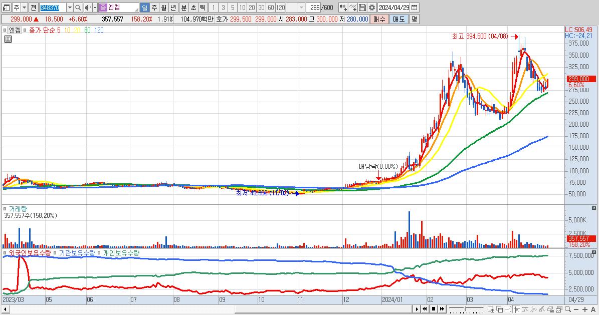 - 엔켐 (299,000원 ▲ 6.6% , 시총: 55,896억, 외국인 순매수 거래금:101억)