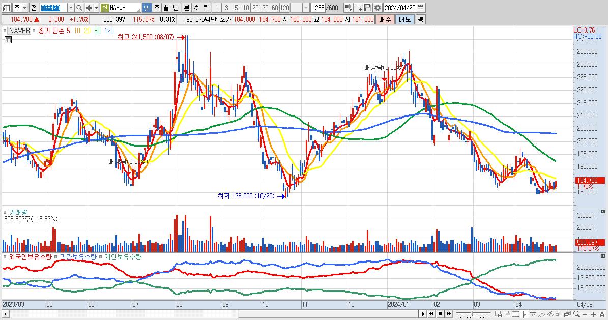 - NAVER (184,700원 ▲ 1.76% , 시총: 299,969억, 외국인 순매수 거래금:122억)