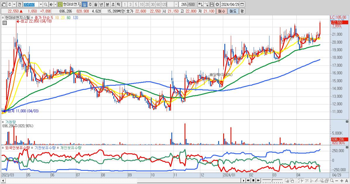 - 현대비앤지스틸 (22,550원 ▲ 7.89% , 시총: 3,400억, 거래량: 696,286, 거래대금:154억, KOSPI)
