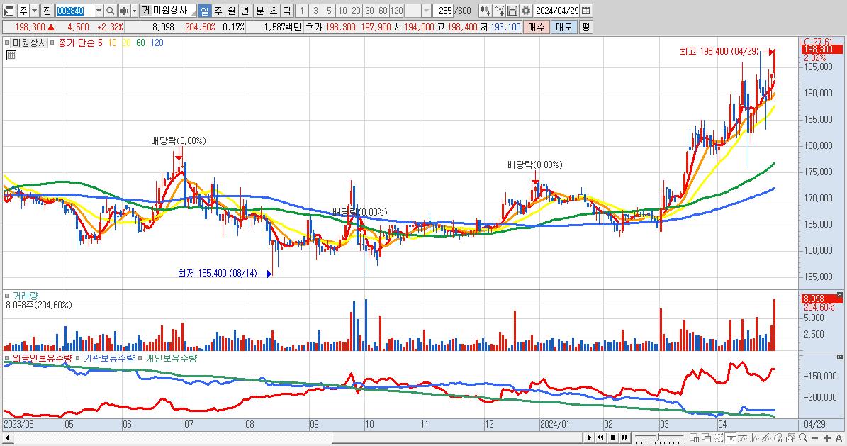 - 미원상사 (198,300원 ▲ 2.32% , 시총: 9,419억, 거래량: 8,098, 거래대금:16억, KOSPI)