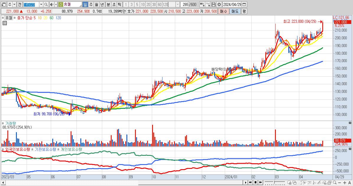 - 휴젤 (221,000원 ▲ 6.25% , 시총: 26,551억, 거래량: 88,979, 거래대금:194억, KOSDAQ)