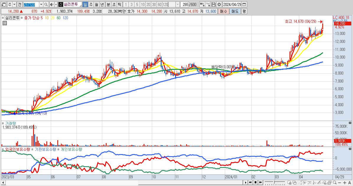 - 실리콘투 (14,280원 ▲ 4.92% , 시총: 8,624억, 거래량: 1,983,374, 거래대금:284억, KOSDAQ)
