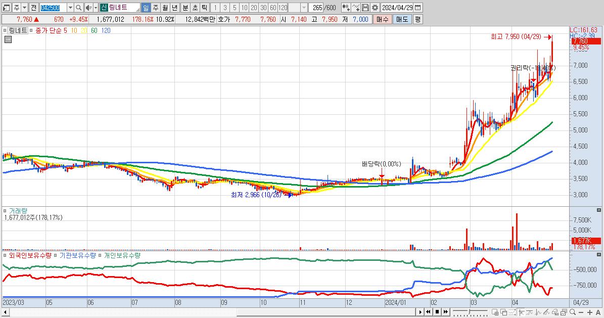 - 링네트 (7,760원 ▲ 9.45% , 시총: 1,192억, 거래량: 1,677,012, 거래대금:128억, KOSDAQ)