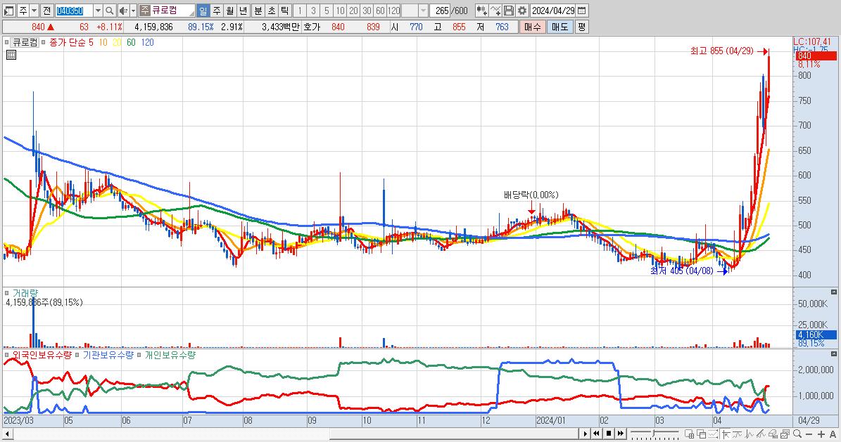 - 큐로컴 (840원 ▲ 8.11% , 시총: 1,201억, 거래량: 4,159,836, 거래대금:34억, KOSDAQ)