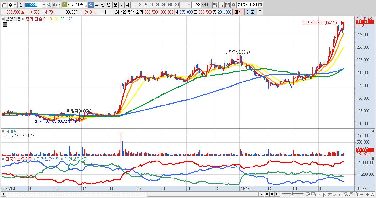 - 삼양식품 (300,500원 ▲ 4.7% , 시총: 22,637억, 거래량: 83,393, 거래대금:244억, KOSPI)