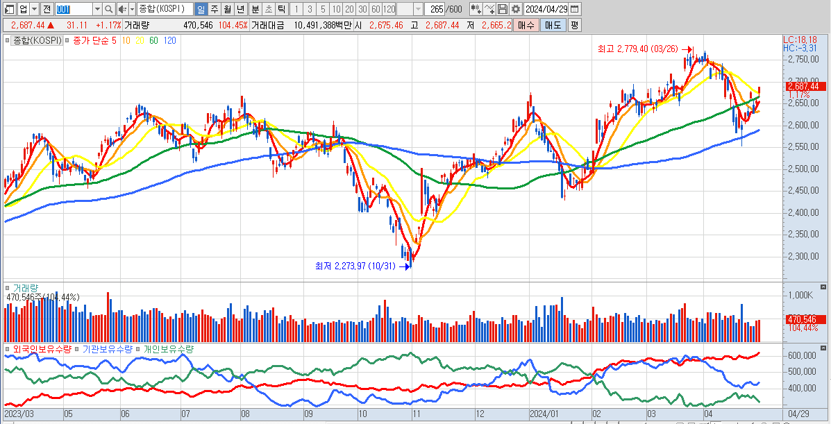 | 04/24 | 2,675.75 | ▲2.01% | -8,662억 | 4,890억 | 3,623억 | 148억 |