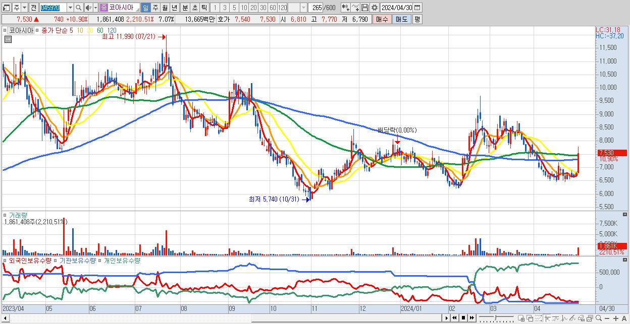 - 코아시아 (7,530원 ▲ 10.9% , 시총: 1,982억, 거래량: 1,861,408, 거래대금:137억)
