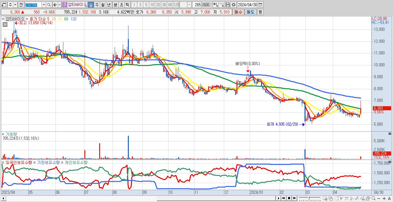- 압타바이오 (6,360원 ▲ 9.66% , 시총: 1,418억, 거래량: 705,224, 거래대금:46억)