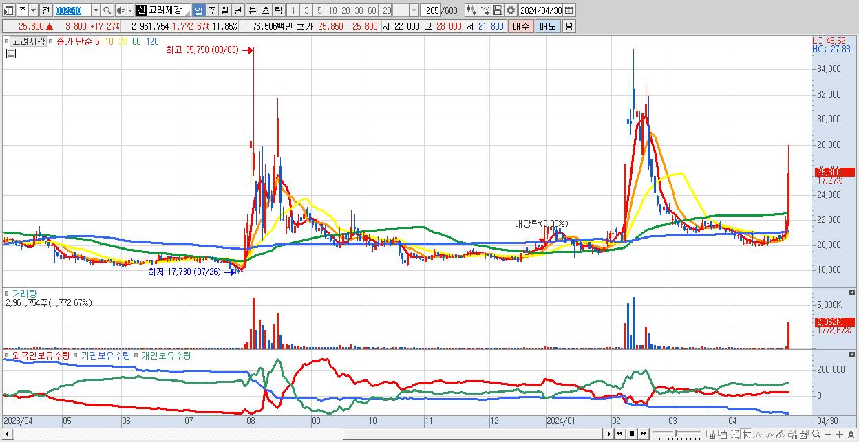 - 고려제강 (25,800원 ▲ 17.27% , 시총: 6,450억, 거래량: 2,961,754, 거래대금:765억)
