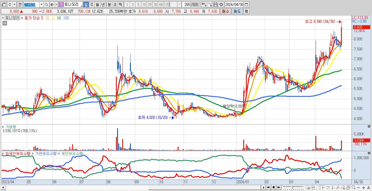 - 토니모리 (8,600원 ▲ 12.86% , 시총: 2,069억, 거래량: 3,036,107, 거래대금:257억)