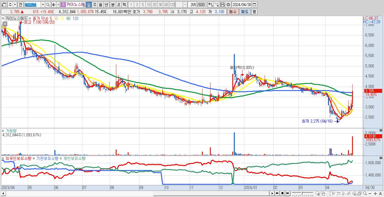 - 카이노스메드 (3,785원 ▲ 19.4% , 시총: 1,057억, 거래량: 4,312,844, 거래대금:166억)