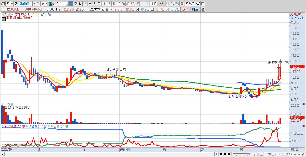 - 한싹 (12,000원 ▲ 15.5% , 시총: 654억, 거래량: 6,660,112, 거래대금:823억)