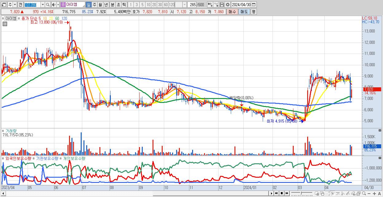 - 아이엠 (7,820원 ▲ 14.16% , 시총: 708억, 거래량: 716,715, 거래대금:55억)