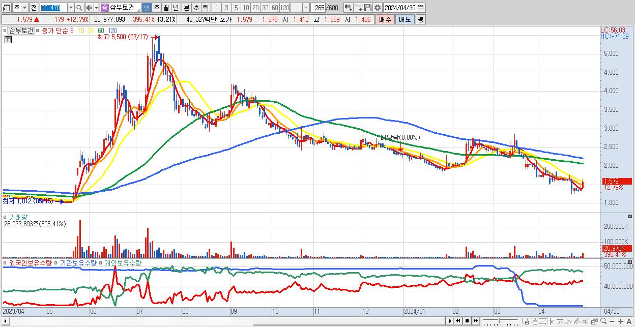 - 삼부토건 (1,579원 ▲ 12.79% , 시총: 3,225억, 거래량: 26,977,893, 거래대금:423억)
