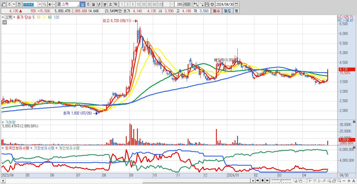 - 스맥 (4,135원 ▲ 15.5% , 시총: 1,664억, 거래량: 5,893,478, 거래대금:235억)